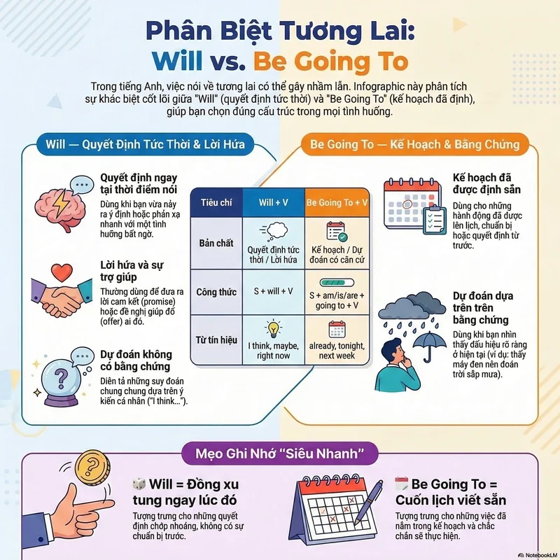 Level 1Học 2 cách nói về tương lai: Will cho quyết định tức thời và lời hứa, Be Going To cho kế hoạch đã định và dự đoán có bằng chứng. Phù hợp cho học sinh lớp 3-4.