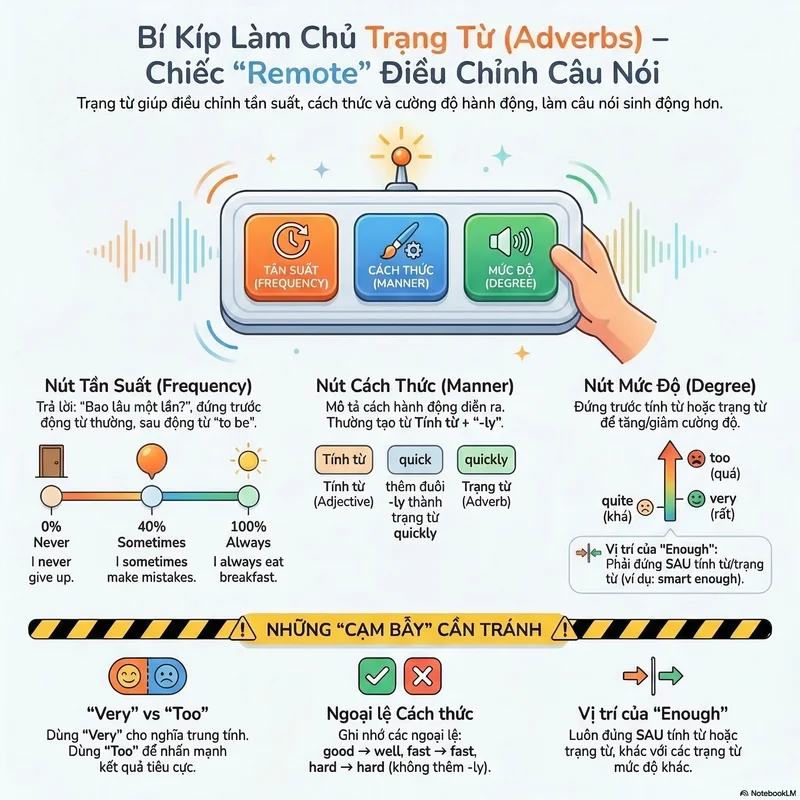 Level 1Học trạng từ tần suất (always, usually, never), trạng từ cách thức (quickly, well) và trạng từ mức độ (very, too). Biết vị trí đúng trong câu. Phù hợp cho học sinh lớp 3-5.