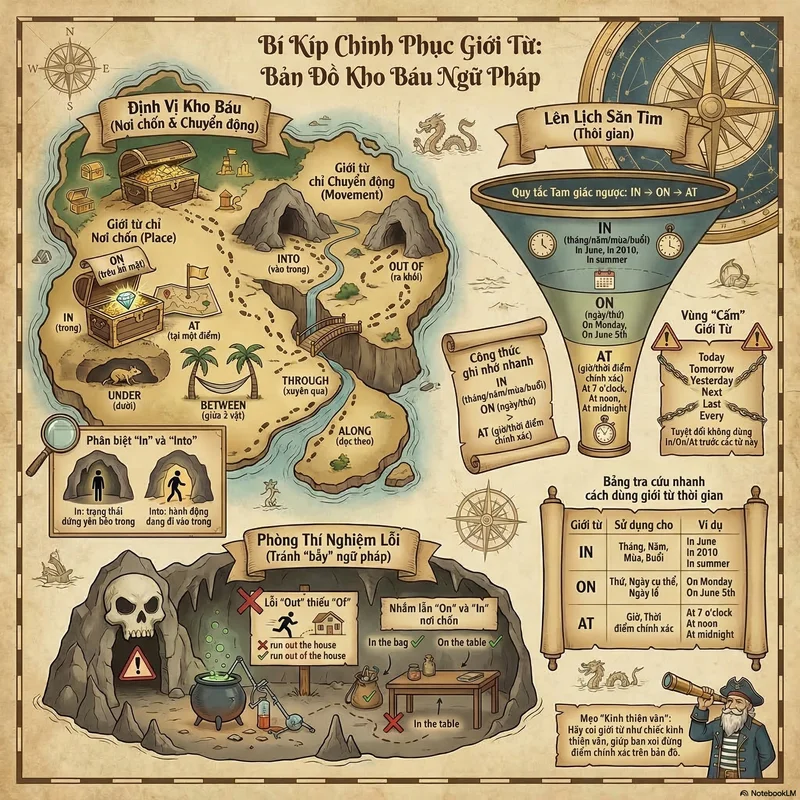 Level 1Học giới từ chỉ nơi chốn (in/on/at/under/behind), thời gian (in tháng, on ngày, at giờ) và chuyển động (to/into/out of). Phù hợp cho học sinh lớp 2-4.