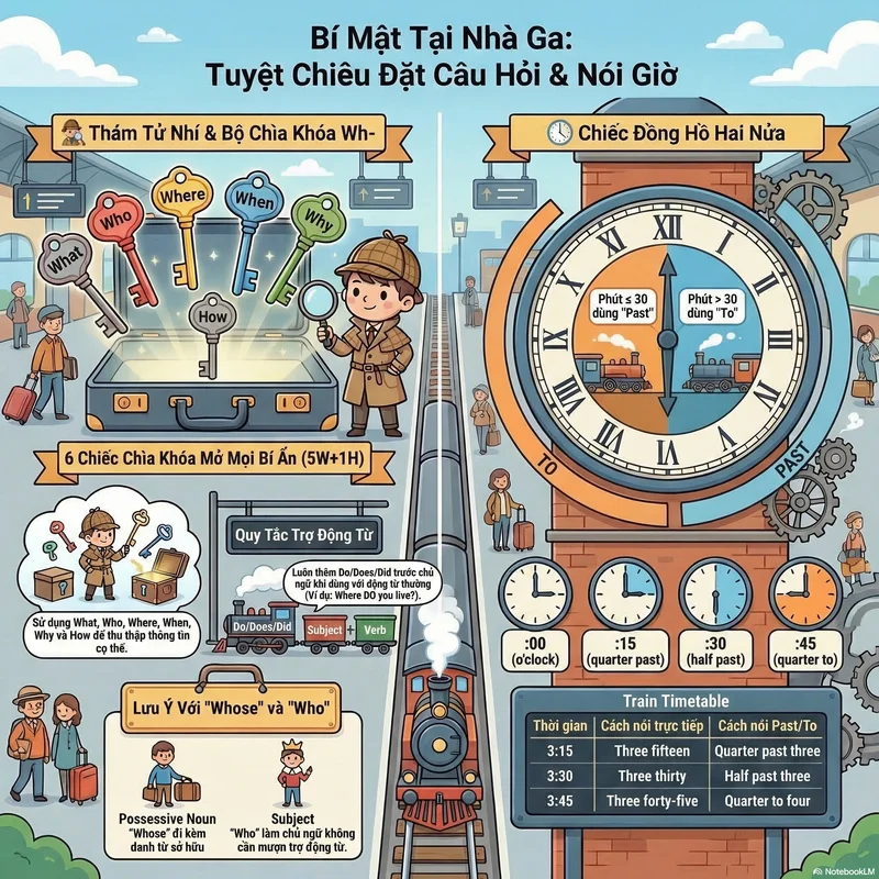 Level 1Học cách đặt câu hỏi với What, Who, Where, When, Why, How và cách nói giờ bằng tiếng Anh (o'clock, half past, quarter to). Phù hợp cho học sinh lớp 2-4.