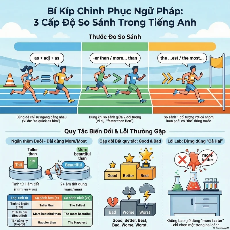 Level 1Học so sánh hơn (taller than), so sánh nhất (the tallest) và so sánh bằng (as ... as). Nhớ quy tắc tính từ ngắn/dài và bất quy tắc. Phù hợp cho học sinh lớp 3-5.