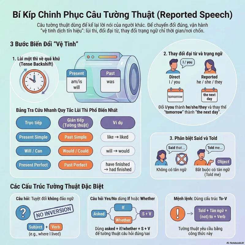 Level 3Học câu tường thuật để kể lại lời nói: lùi thì, đổi đại từ và thời gian; phân biệt said/told và câu hỏi gián tiếp. Phù hợp lớp 5.
